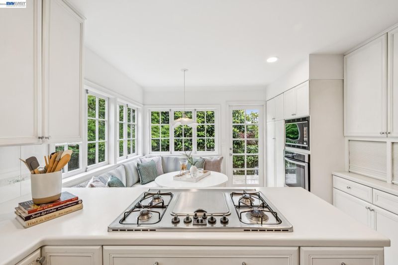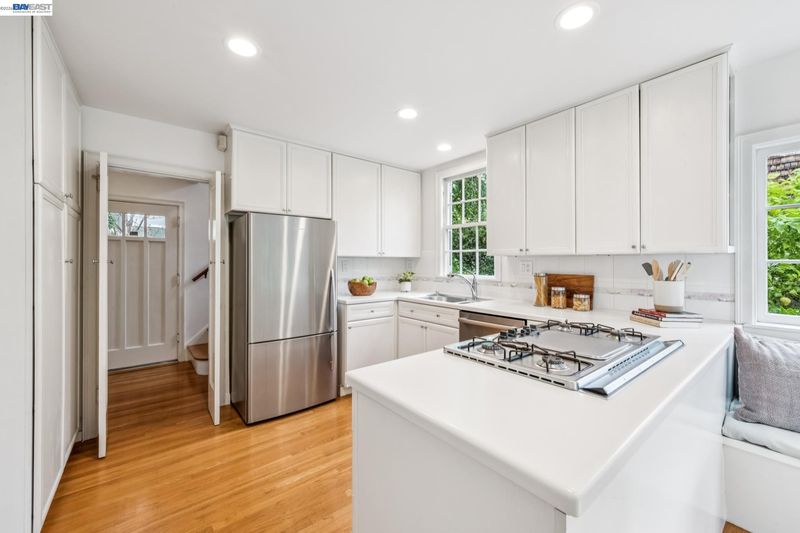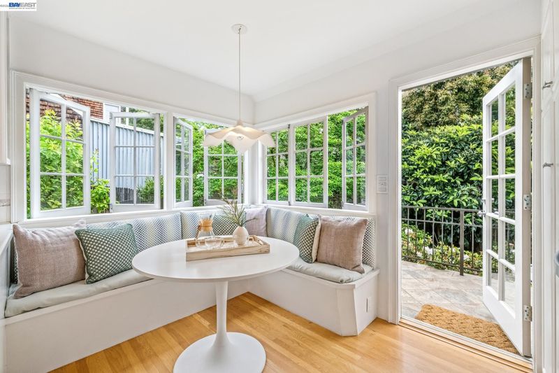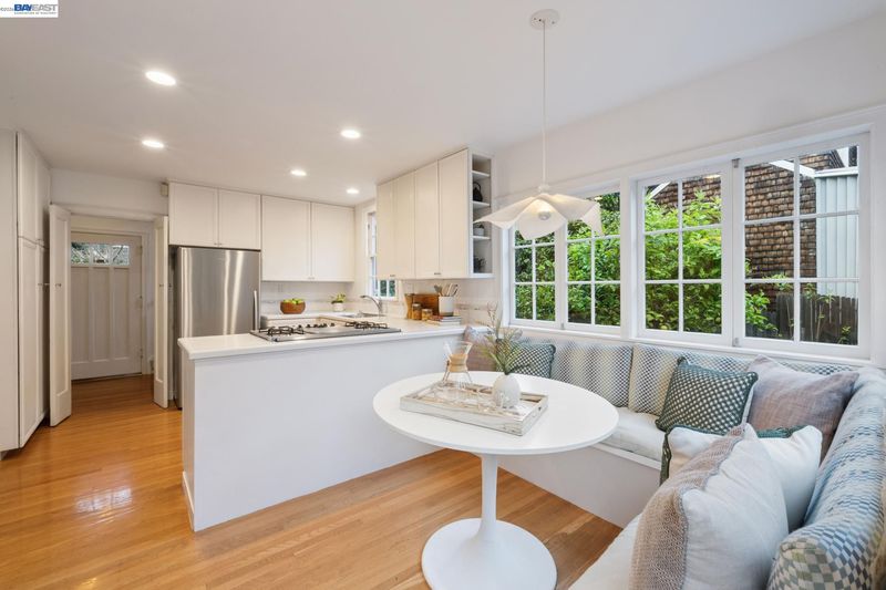 Prepare to be delighted by this tastefully updated 3BD/1.5BA home only blocks away from Solano Avenue! Fronted by two custom Berkeley Mills gates, this 1319 SQFT home lives large with bonus spaces, a 1-car garage, and a spacious corner lot. Sunlight streams through mullioned windows into the home’s main living and dining area, featuring gorgeous hardwood floors, fireplace, built-in shelves, and an office sunroom with custom desk surrounded by windows and garden views. A powder room is tucked below the stairs. The bright and inviting kitchen has been completely renovated with a large banquette and a wall of windows with patio access for indoor/outdoor living. Step outside to enjoy the tranquil gardens and fruit trees, where there’s plenty of space to entertain, play or unwind. Upstairs find three bedrooms which share a full hall bath. The home offers a newly upgraded electrical panel and basement area for storage or tinker space. Out your front door, explore the vibrancy of Thousand Oaks including its top public schools, playgrounds, and Solano’s shops and restaurants, or venture further to take part in Berkeley’s many world class amenities. Energy Score: 5
