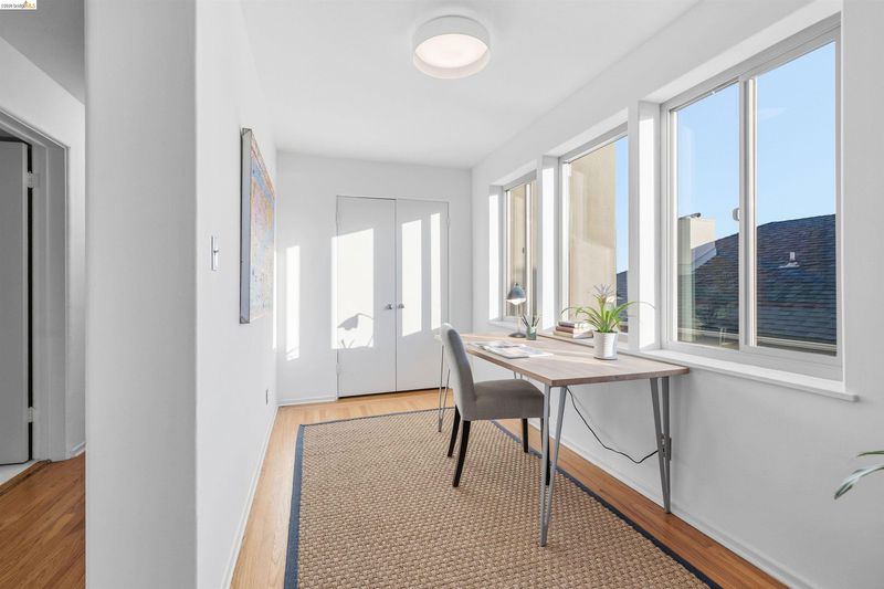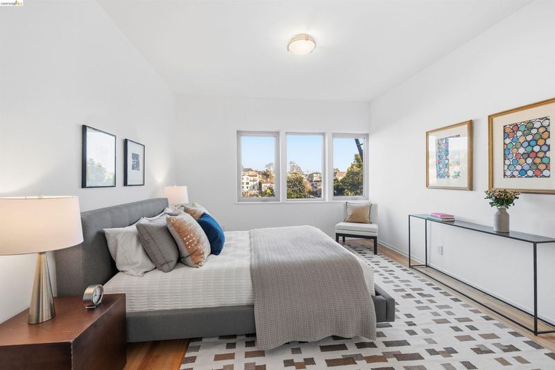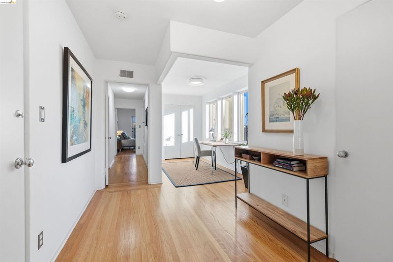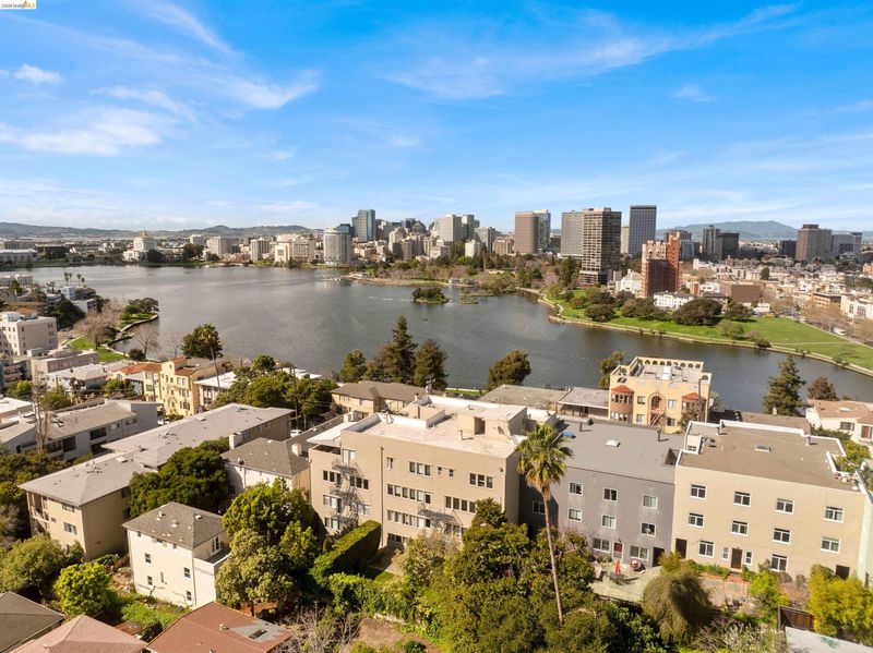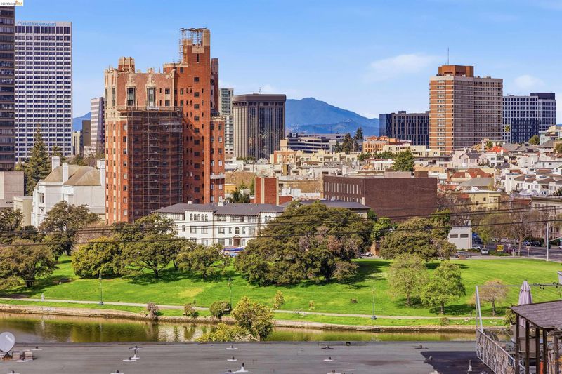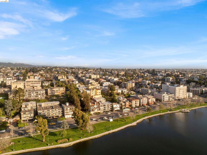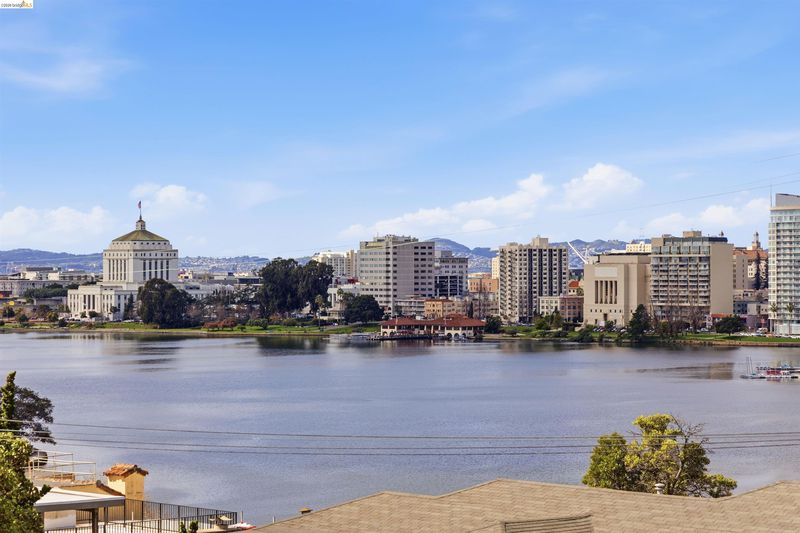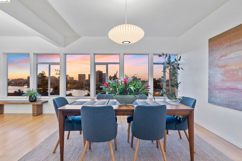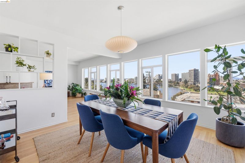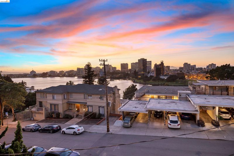 Perched on the edge of Lake Merritt, this 1,649-SF corner residence lives like a house in the sky. A full wall of west-facing windows floods the living room with light and front-row sunsets stretching all the way to Mount Tam & SF. Golden hour here feels cinematic. Lake views follow you into the formal dining room, elevating weeknights and dinner parties alike. The updated kitchen pairs stainless steel appliances with generous counters and storage. Built in 1951, the home blends clean mid-century lines, hardwood floors, and timeless character. A spacious entry with bonus nook makes an inspiring office or add a wall for a third bedroom with closet. The stone fireplace with wraparound mantle anchors the living room, with a wall of built-ins for books, art, and vinyl. The oversized secondary bedroom offers three closets, built-ins, architectural detail, and room to flex—lounge, studio, or epic media room. The primary suite features ample closets, more sweeping views, and a private full bath with tub for unwinding. A dedicated garage provides easy off-street parking, and a shared sunny level garden offers fresh-air escapes. Just outside: miles of waterfront paths, the historic Cleveland Cascade, and the vibrant Saturday farmer’s market. Big-space living. Iconic Oakland views.