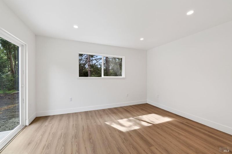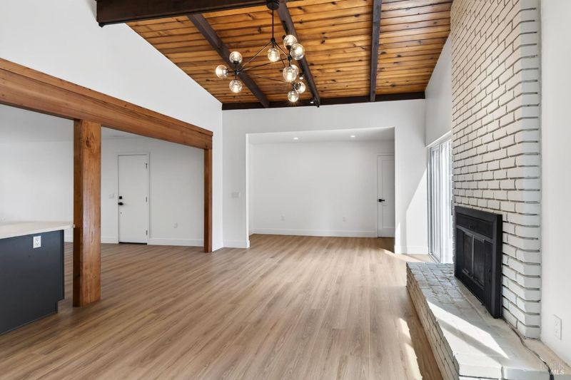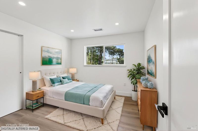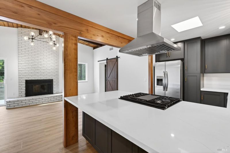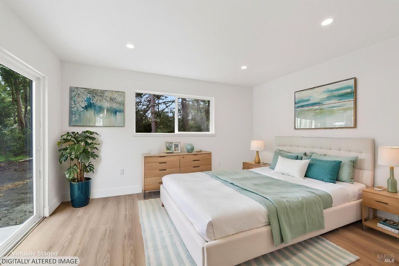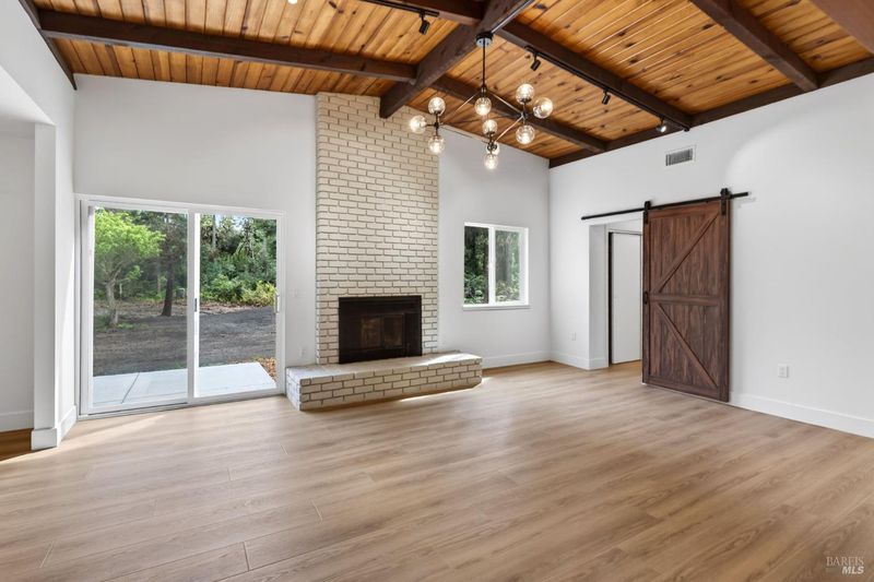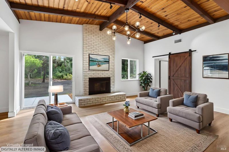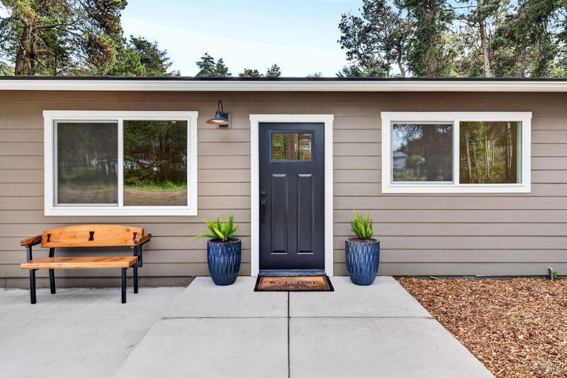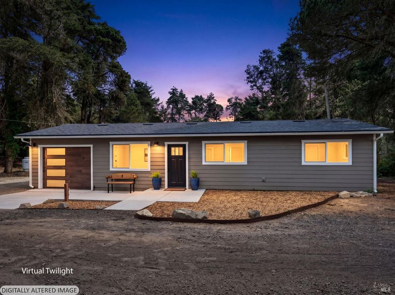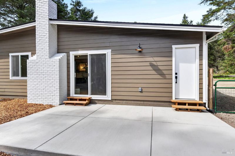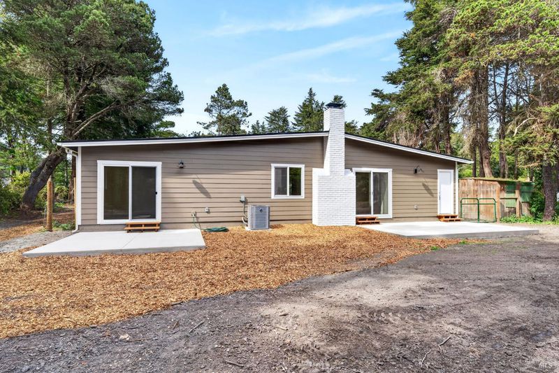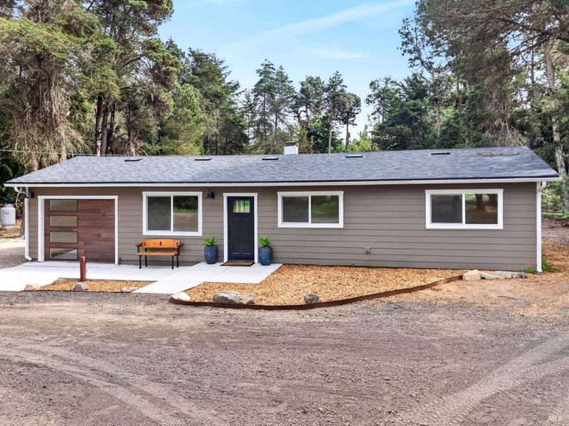 This stylish single-story home has been completely renovated from top to bottom. The inviting living room features vaulted tongue and groove open-beam ceilings, a chandelier, and a cozy fireplace. A sliding glass door on the south side opens to a backyard patio, while the other side flows seamlessly into the kitchen. Natural light pours in through a skylight, highlighting the kitchen's luxurious quartz counters, shaker cabinets, and floating shelves. Avid cooks will appreciate the new appliances and the propane stove set into a generous peninsula, ideal for gathering with family and friends at the bar seating. Luxury is in the details, like the solid-core interior doors and the convenient sensor lights in each closet. The primary bedroom has its own sliding glass door to a private backyard patio. The bathrooms sparkle with skylights and premium Bedrosian tiles that are comfortably heated from beneath. In addition to the four bedrooms and two baths, the home offers two different living room spaces and a large designated laundry room. The attached garage features an insulated garage door with windows and a beautiful Kona color steel plank exterior with flexibility for use as a workshop instead. Energy efficiency is top of mind with double-pane windows throughout, an on-demand propane water heater and central heating and cooling. A wood-burning fireplace adds extra warmth and that cozy ambiance on winter evenings. Situated on nearly an acre in the sunbelt, this property offers a blank canvas for your landscaping vision. Create garden beds, plant flowers, or establish a spacious lawn. A mystery fruit tree stands in the center of the backyard, possibly a black cherry, ready to reveal its bounty each summer. Surrounded by trees, the private setting feels like a peaceful country retreat, yet it's still conveniently close to town. Jug Handle State Park is nearby with endless forest trails and the coast is beckoning from a couple miles away with beaches and stunning headlands viewpoints. Seize this opportunity to own a turnkey residence, and start enjoying the coastal life in style.