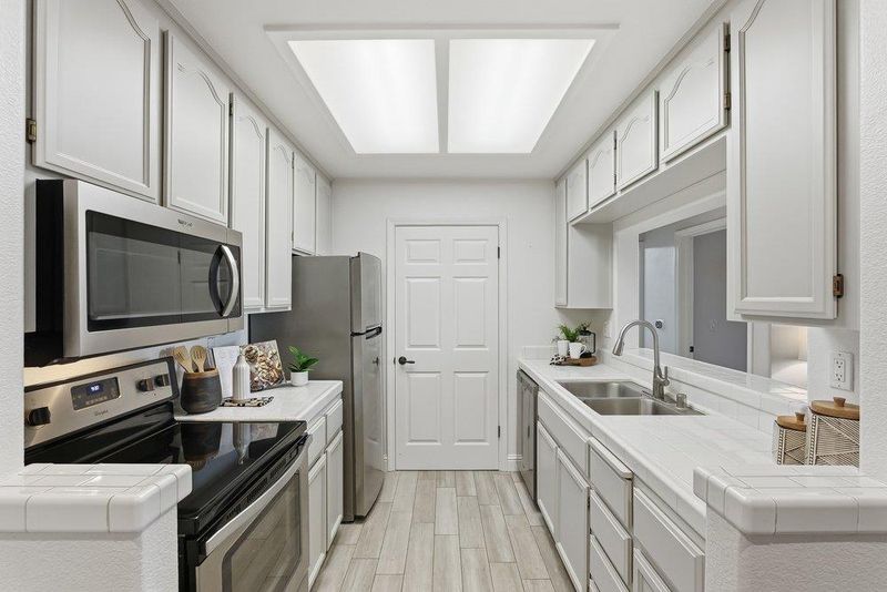 - Countertop - Tile, Dishwasher, Garbage Disposal, Microwave, Pantry, Exhaust Fan, Oven Range - Electric, Refrigerator