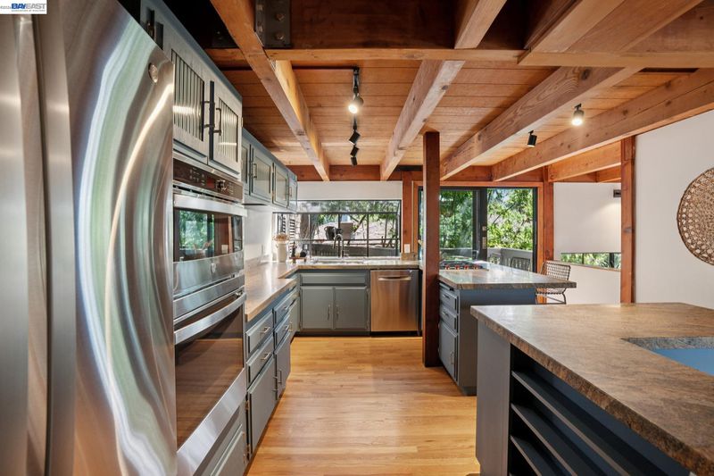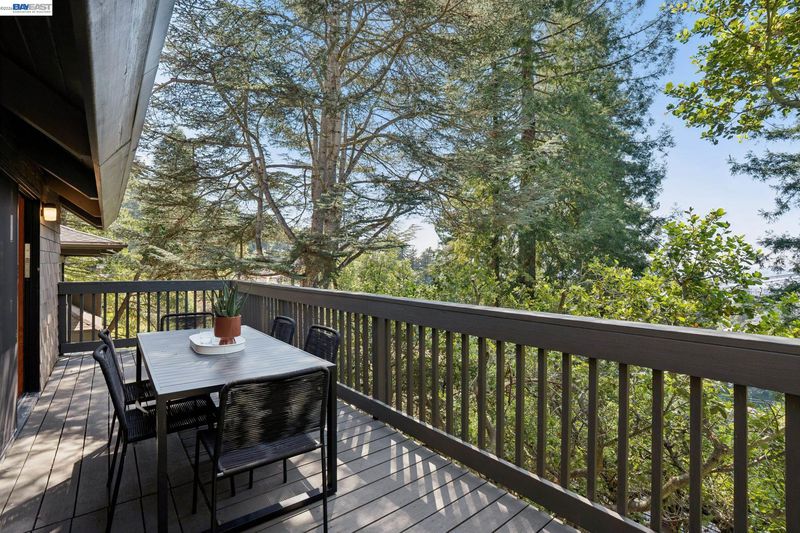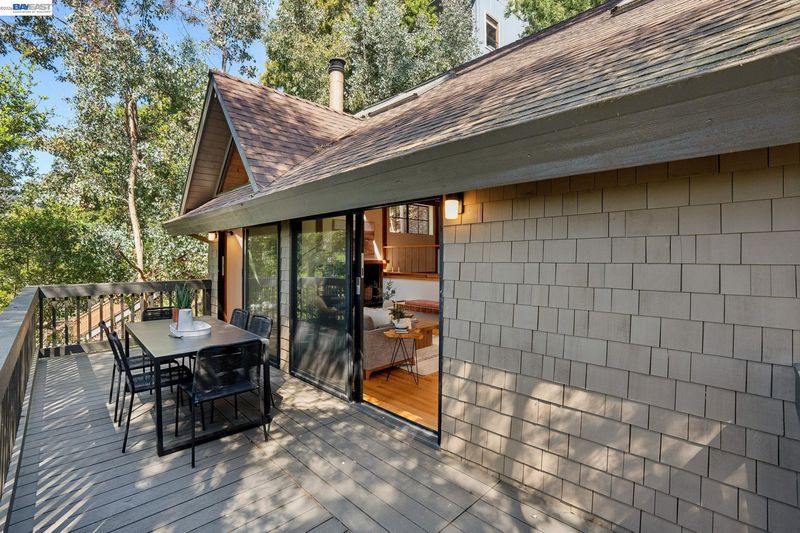 Tucked among the trees in the lower North Berkeley Hills, this striking contemporary home offers a rare sense of privacy and calm. Designed to connect seamlessly with its natural setting, the residence features soaring ceilings, multiple skylights, and decks on every level that bring the outdoors in. Recent updates add a fresh, modern feel while preserving the warmth of natural wood, tile, and stone throughout the home. The entry level includes two generously sized bedrooms, an updated split bathroom, and a shared deck overlooking lush greenery. Upstairs, the main living level showcases a dramatic living room that opens to a wide front deck—an inviting space for entertaining or relaxing among the treetops. At the center of the home, the thoughtfully planned kitchen is equipped with granite countertops, a Wolf cooktop, and new stainless steel appliances installed in 2025. The top floor is devoted to a spacious primary suite featuring its own private deck, along with a neighboring office where a large picture window frames sweeping views of the San Francisco Bay. Set in a tranquil neighborhood known for its network of hidden pathways and nearby parks, the home also offers convenient access to North Berkeley’s renowned dining scene, UC Berkeley, and BART. BESO Energy Score: 3