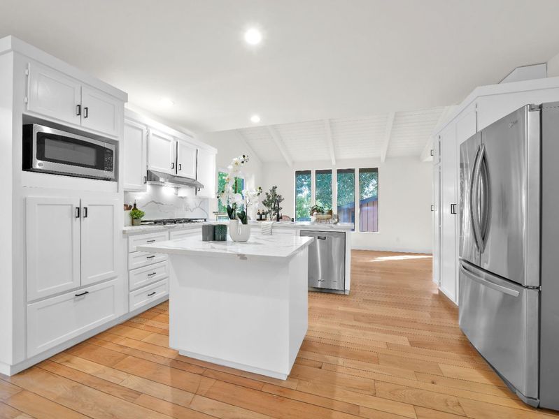 - Cooktop - Gas, Countertop - Quartz, Dishwasher, Hood Over Range, Island, Oven - Built-In, Pantry, Refrigerator
