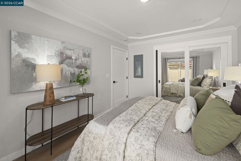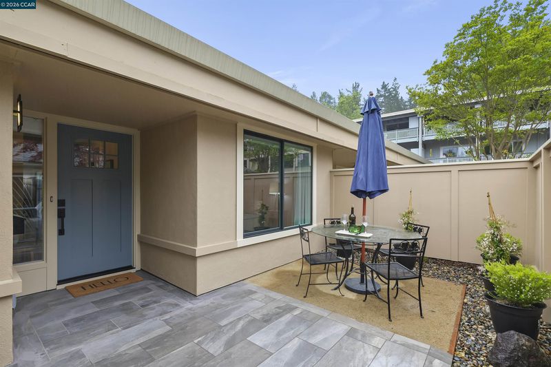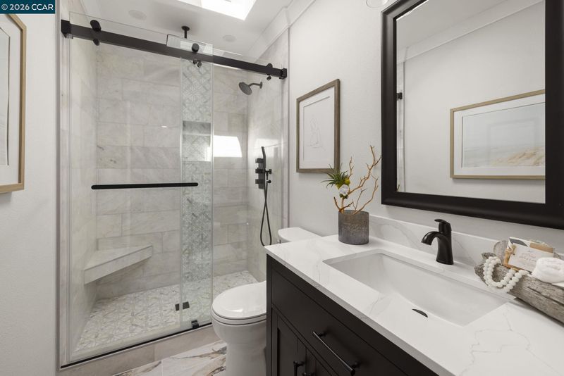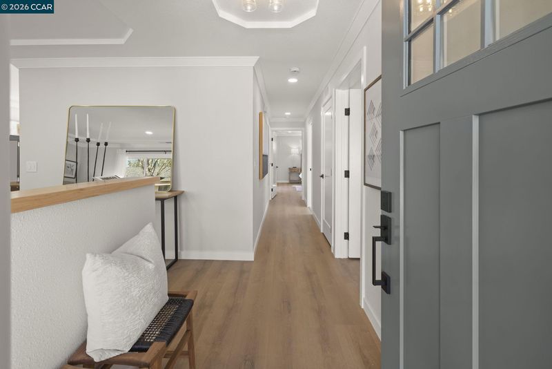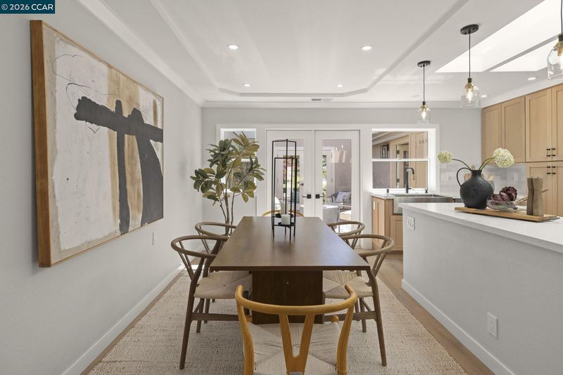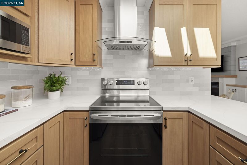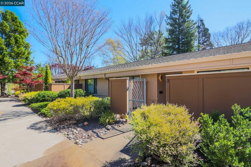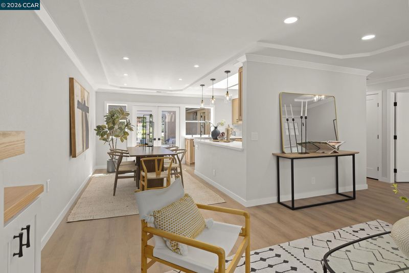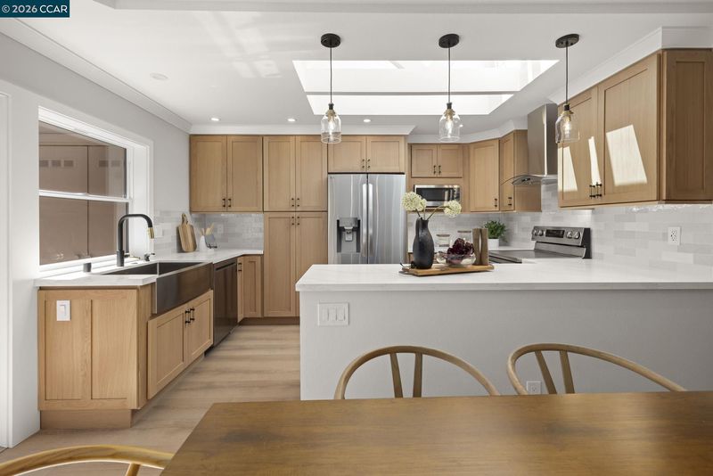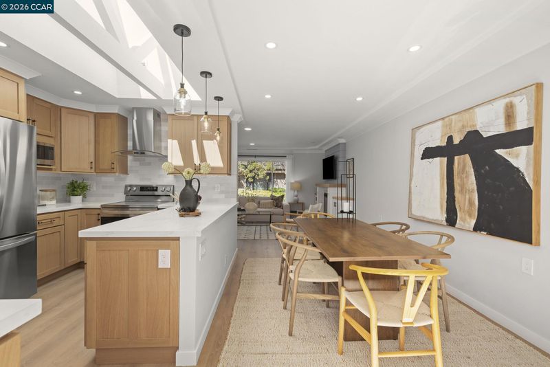 Gallo and Associates presents this single row, beautifully redesigned and remodeled home with high-end finishes and abundant natural light. The custom kitchen features an expansive skylight, American white oak shaker cabinetry, quartz countertops, and new LG stainless steel appliances, including a wine refrigerator. The living room offers a large electric fireplace with custom shiplap surround, solid oak mantel, built-in cabinetry, and TV/HDMI hookups. The expanded primary suite includes a spa-inspired bath with custom marble shower, dual showerheads, skylight, and mirrored closet doors. The guest bedroom features a large reach-in closet, while the updated guest bath offers a marble tub surround, skylight, and additional storage. Additional highlights include recessed LED lighting, coved ceilings, bedrooms prewired for ceiling fans, a laundry closet with GE laundry center, new double-pane windows and French doors, central HVAC with new ductwork, USB-equipped outlets, and a new electrical subpanel. Enjoy a private rear brick courtyard with French doors and a separate entry garden with tile and custom steel gate. All work permitted by Rossmoor MOD and the City of Walnut Creek.