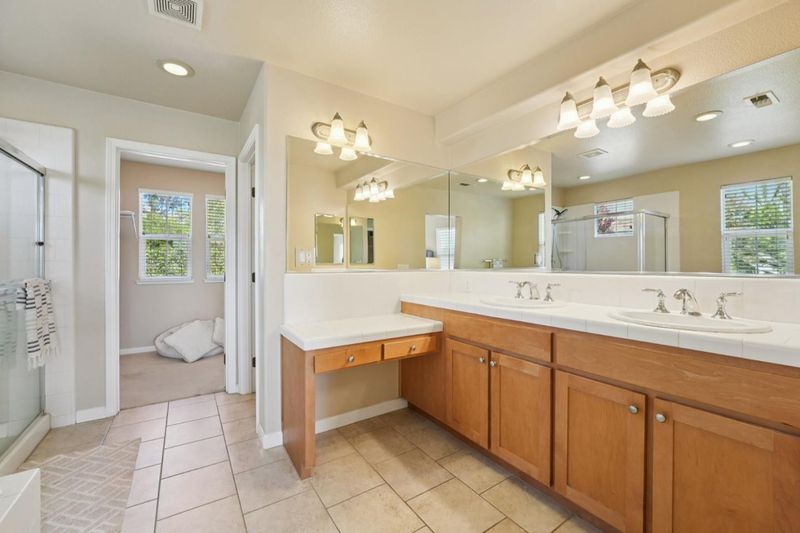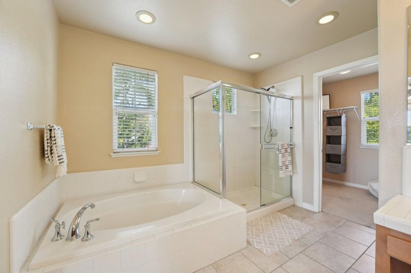 - Shower over Tub - 1, Double Sinks, Tub in Primary Bedroom, Half on Ground Floor, Primary - Oversized Tub, Primary - Stall Shower(s)