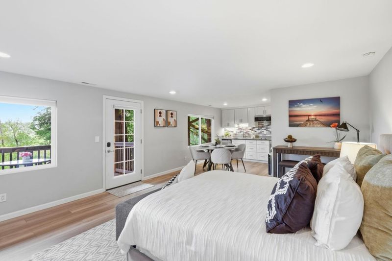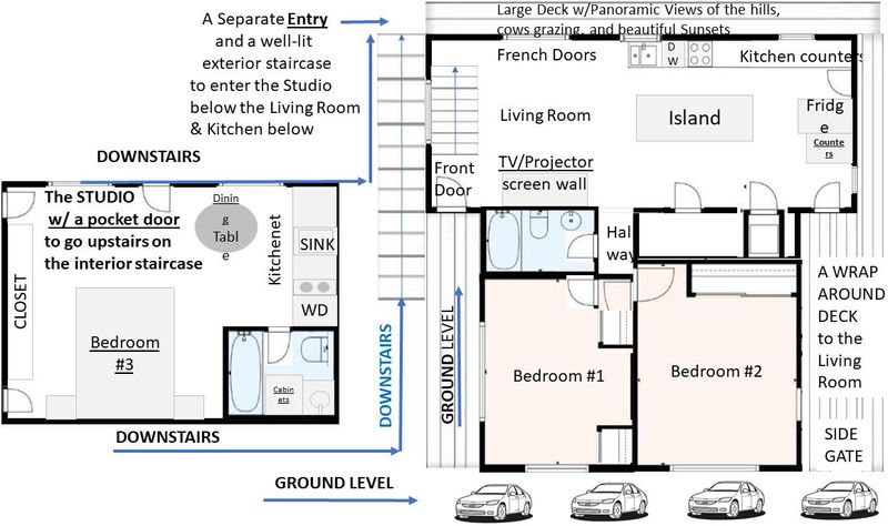 Welcome to this nature-lover's paradise home with walking trails to Glenwood preserves, 4 parking spaces, updated and spacious bedrooms, kitchen and baths, panoramic, spectacular views of the sunsets, birds, and cows from both deck. Easy walk to the award-winning Vine Hill Elementary. Near Hwy 17 - apprx. 6 miles to Santa Cruz or 27 miles to the heart of Silicon Valley. The upstairs offers 2 large bedrooms, 1 bath with subway tiles, laundry, and a Chef's kitchen with stainless steel appliances, soft-close cabinets, and a large island with quartz countertops, ideal for any gatherings. The downstairs offers a large updated Studio with storage, laundry, and a separate entry - perfect for guests or extra income. Enjoy BBQ parties on a large deck, watch beautiful sunsets from both decks or cozy evenings with your favorite movies on a projector screen wall upstairs. The home has an approx. $260k in upgrades (see list), including rain and filter water systems, updated plumbing, heating, and flooring, enhancing its appeal and comfort. Whether you're enjoying the comfort of indoor and outdoor living or exploring the vibrant community and nearby points of interest, this home offers a wonderful living experience. Don't miss this golden opportunity to make this house yours.