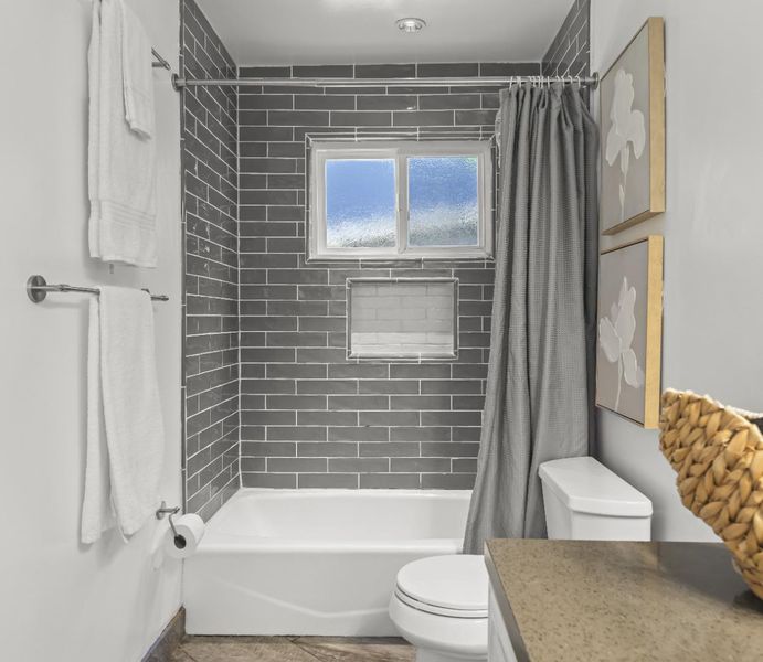 - Double Sinks, Stall Shower, Tile, Tub in Primary Bedroom, Updated Bath