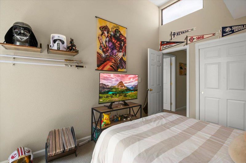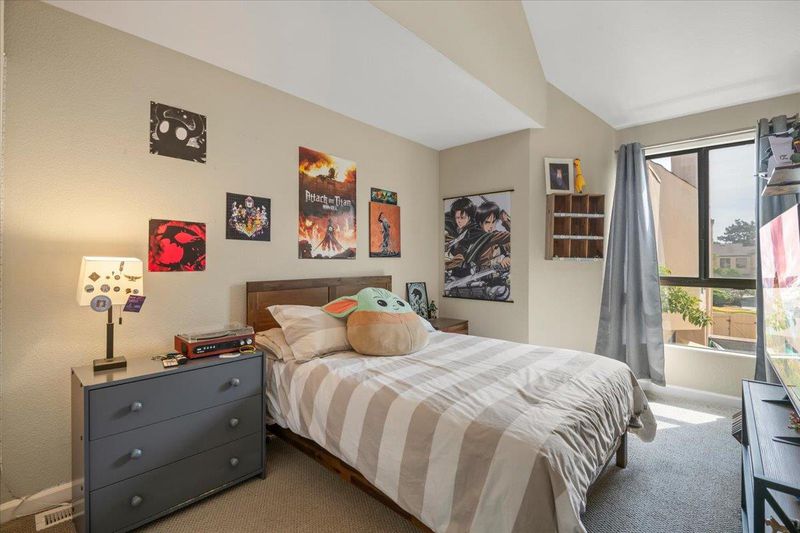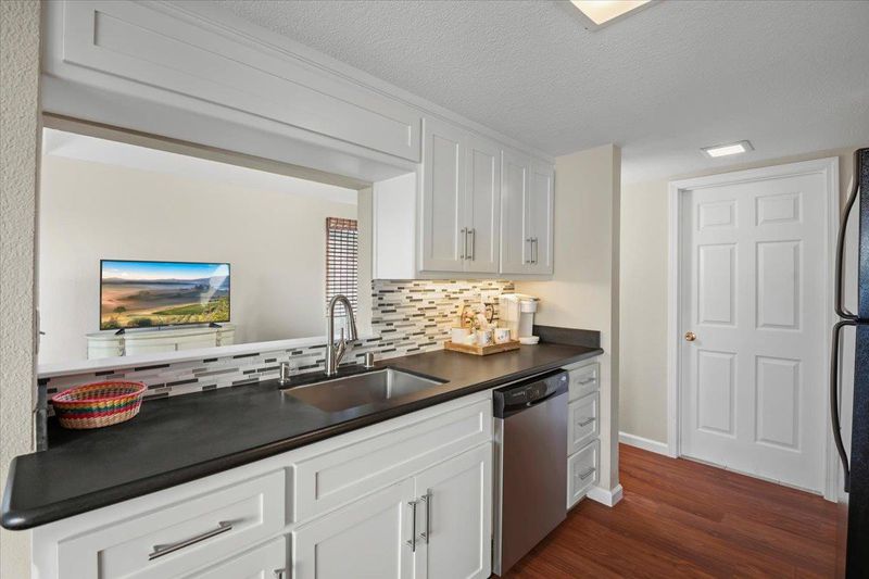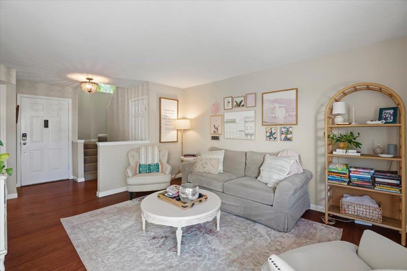 This unit was a builder special. Its a 1,381 sq ft end unit. The additional sq footage is a first level family / bonus room with vaulted ceiling. The updated kitchen has all wood shaker style cabinets and solid granite counters. The backsplash is glass tile. All electric appliances, cooktop, oven, dishwasher, microwave oven with hood exhaust. There is a refrigerator. The living room has a wood burning fireplace. The first level flooring is laminate. There is a1/2 bath powder room with solid stone counter top and vessel sink. Indoor laundry room with washer and dryer included. 3 newer sliding glass doors lead to the garden style patio retreat. 2 upstairs bedrooms with high ceilings. The second level landing area has additional storage. Bathroom has solid stone counter tops. The Forced air heating and air conditioning was recently replaced along with the water heater. There is 1 assigned parking spot at carport and 1 assigned uncovered in gated area.