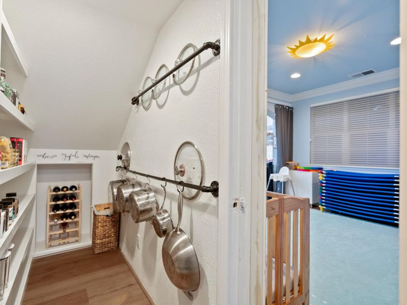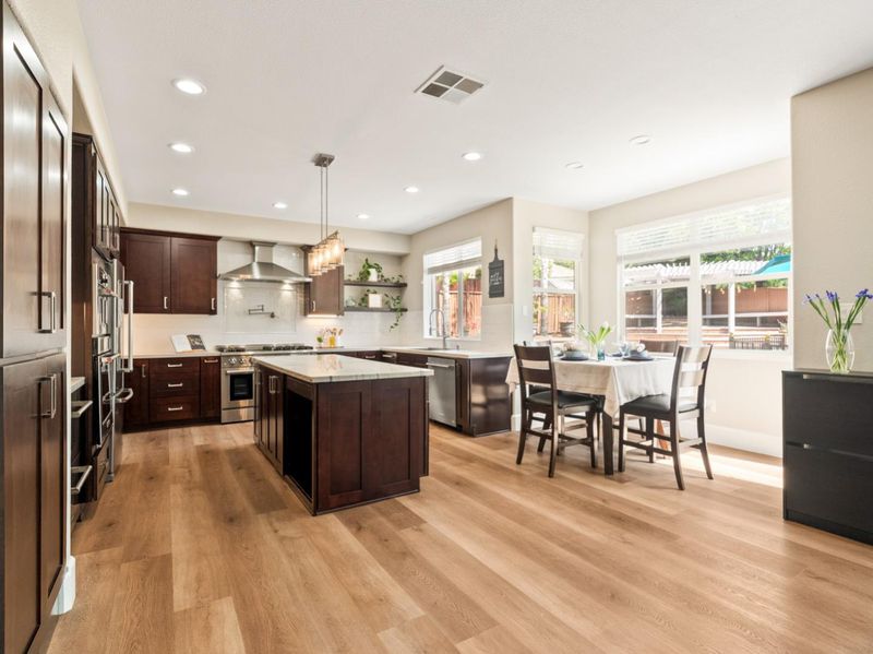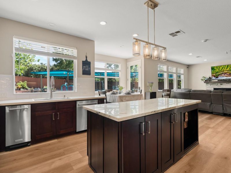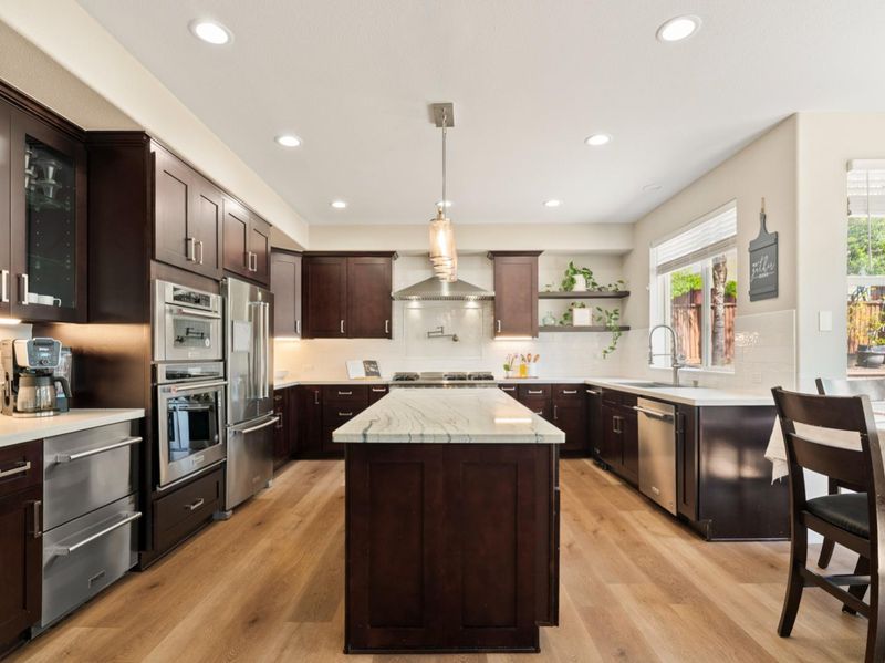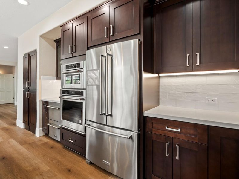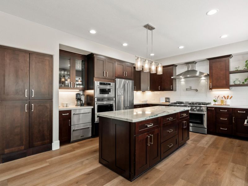 - 220 Volt Outlet, Cooktop - Gas, Countertop - Granite, Garbage Disposal, Hood Over Range, Island, Microwave, Oven - Electric, Oven - Gas, Oven Range, Pantry, Refrigerator, Trash Compactor, Wine Refrigerator