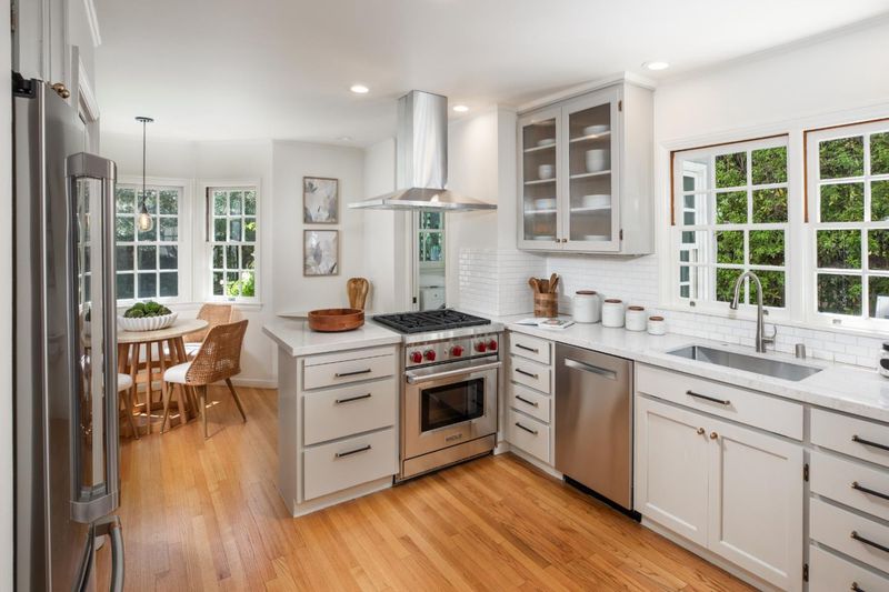 Set on a charming tree-lined street in the desirable South Gate neighborhood, this elegant Tudor blends timeless character with inviting indoor-outdoor living. Surrounded by mature landscapingincluding striking palm and olive treesthe property welcomes you with a covered front porch and expansive patio with a fire table, while the side yard features a putting green, and the rear offers a deck for al fresco dining. Inside, a formal entry leads to a stunning LR w/ soaring vaulted ceilings, a FP, and abundant natural light. A bright formal DR opens to the front patio, and the handsome eat-in kit boasts SS appliances and a charming breakfast nook w/ bay window. The main level also includes a stylish powder & laundry rm, and a lovely family rm with French doors opening to the rear patio. Upstairs, the serene primary suite enjoys leafy green views, a beautifully appointed bathroom with dual sinks and a glass-enclosed shower, and a walk-in closet, while two add'l bedrooms share a hall bath. Additional spaces (not included in square footage) are the amazing 3rd flr finished attic w/ vaulted ceilings and tremendous possibilities, a partial basement for extra storage, and detached 2-car garage/flex space w/ kitchen, full bath & loft. Outstanding public schools.